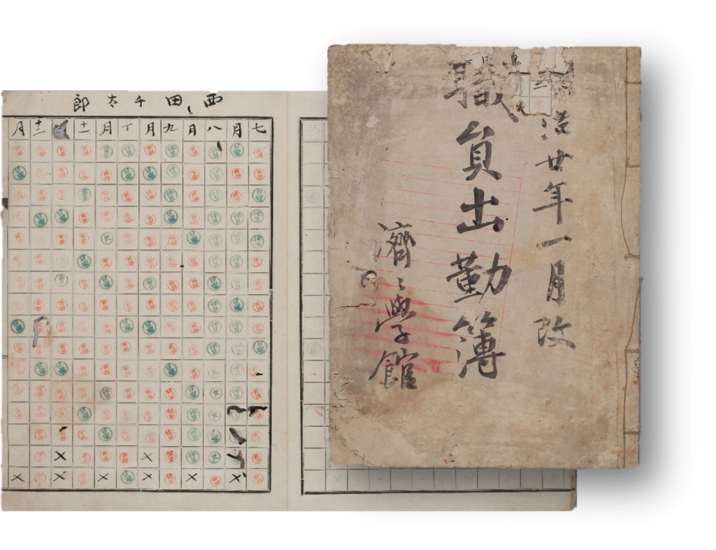 この展示では、西田が出勤していた様子を示す職員出勤簿や、「済々学館」印が押された英語の教科書などを展示します。