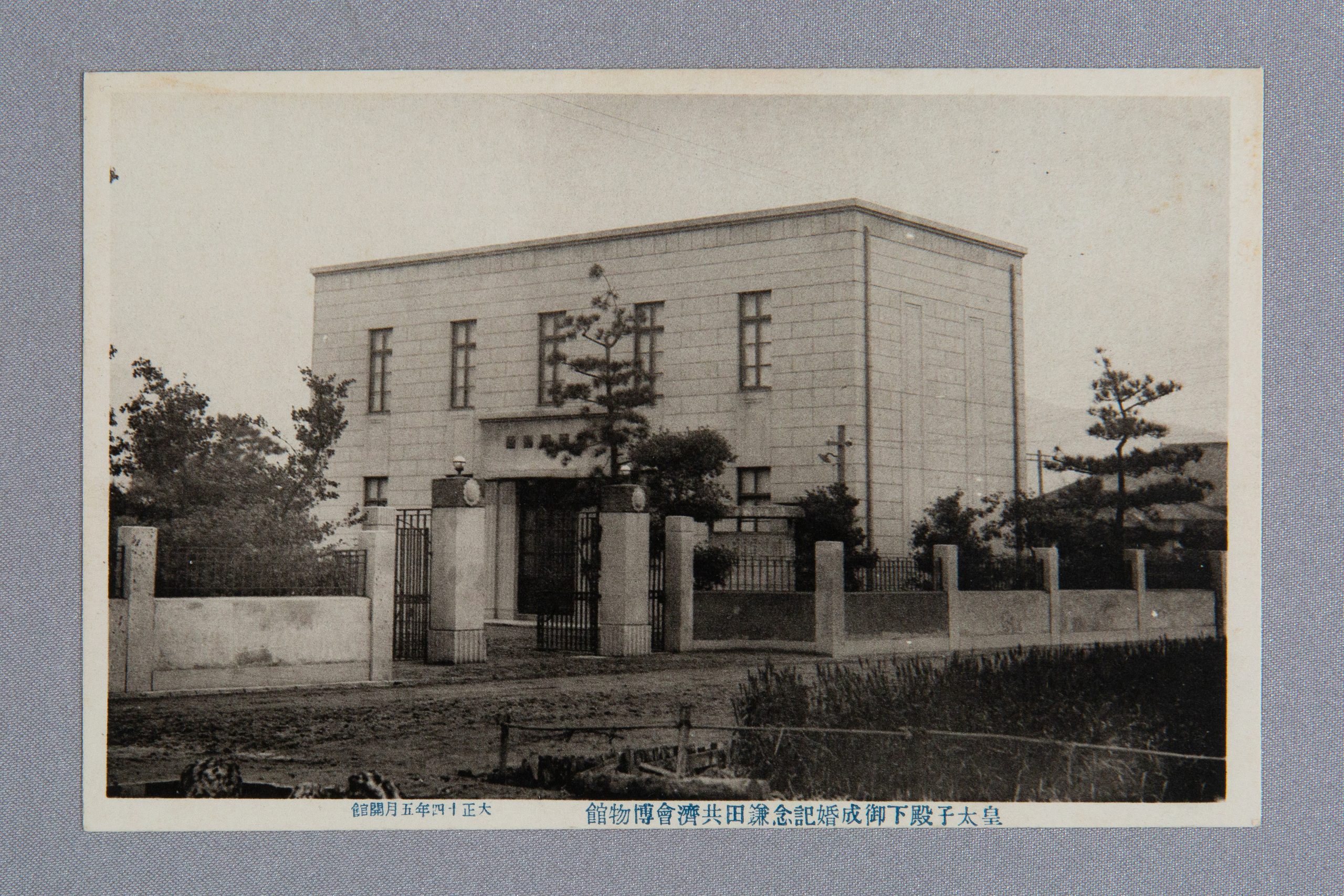 博物館建物、皇太子殿下行啓記念碑、第1回陳列資料の中から10点を選び計12点を絵葉書にして松平家や京極家など資料出品者のほか、県内の学校や研究者等に寄贈しました。