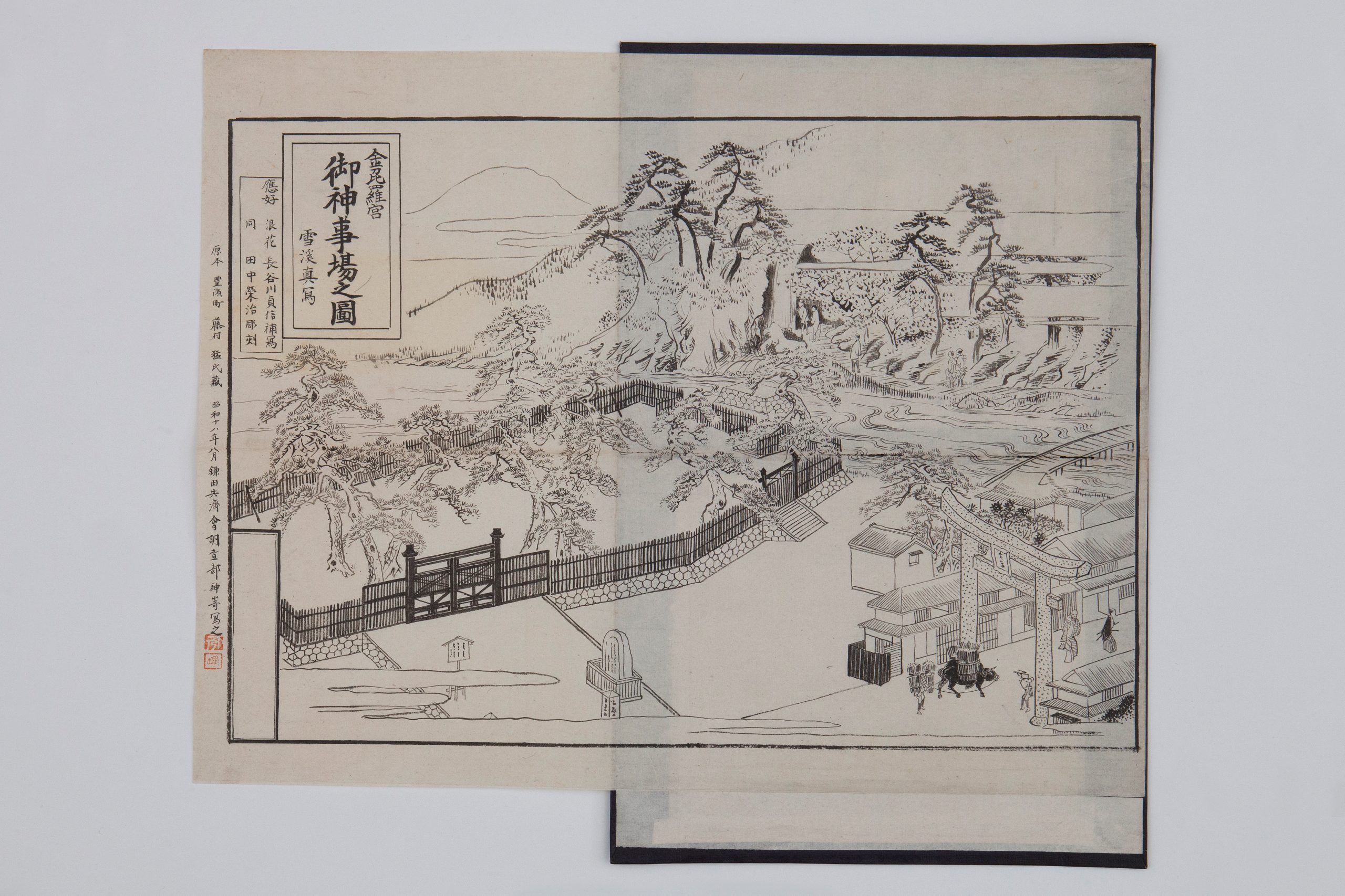この絵図は金毘羅参詣の参拝者向けの土産物として販売された「こんぴら絵図」と呼ばれる木版画を、筆を使って模写しています。 -